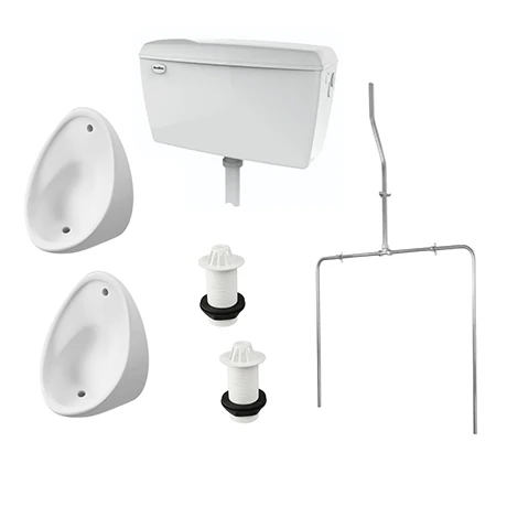 A complete exposed urinal pack consisting of two 500mm urinal bowls and an exposed 9 litre automatic plastic urinal cistern. This Cove complete auto flushing urinal pack is the perfect choice for all commercial installations.
