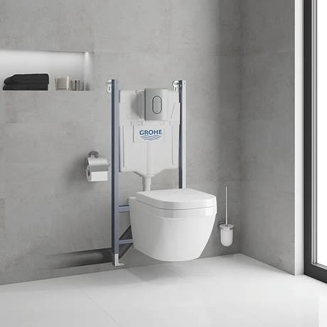 The Grohe Solido Euro Arena WC Pack features a wall hung toilet with a practical, space-saving projection of just 540mm. This all in one solution also includes a steel support frame for secure installation and a cistern to conceal neatly within the wall. The toilet has rimless technology for easy cleaning, while the soft close toilet seat prevents any slamming. A contemporary and ecological dual flush plate controls its powerful Triple Vortex Flush.