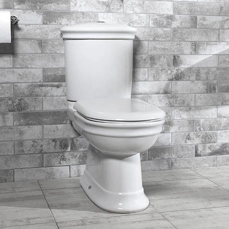 A beautifully traditional close coupled dual flush push button toilet from Silverdale Bathrooms, part of the Hillingdon range of sanitary ware. Features a stylish and elegant double roll rim and soft edges.
