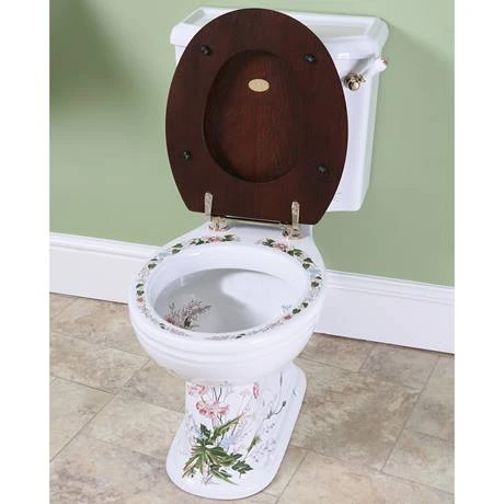 A beautifully traditional Victorian garden pattern close coupled toilet from Silverdale Bathrooms, featuring a elegant Victorian garden pattern which has been fired into the glaze.